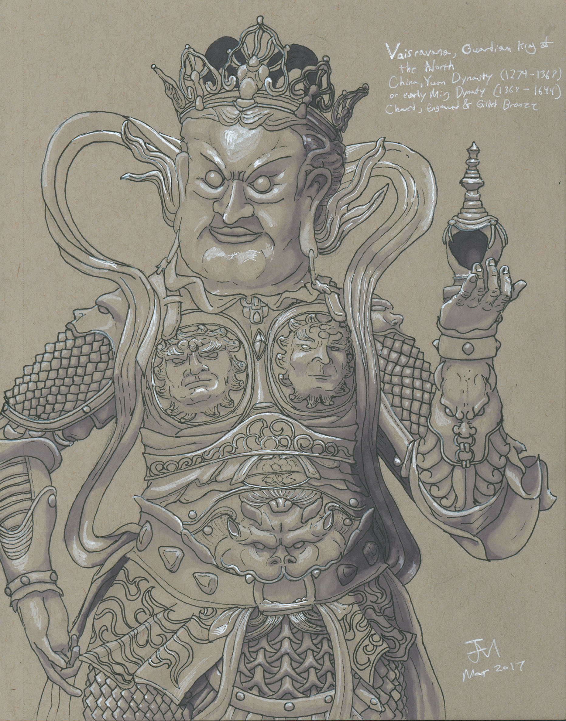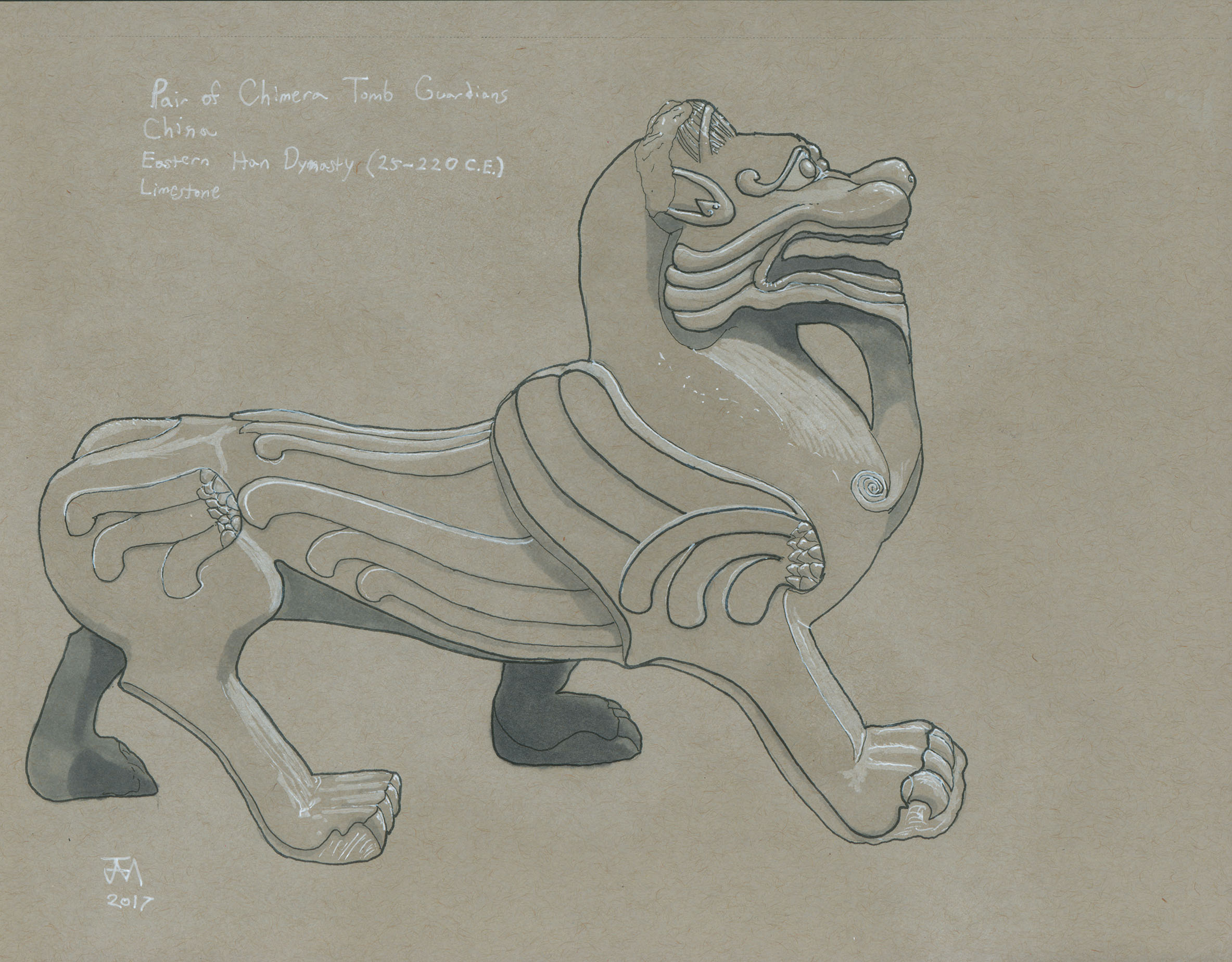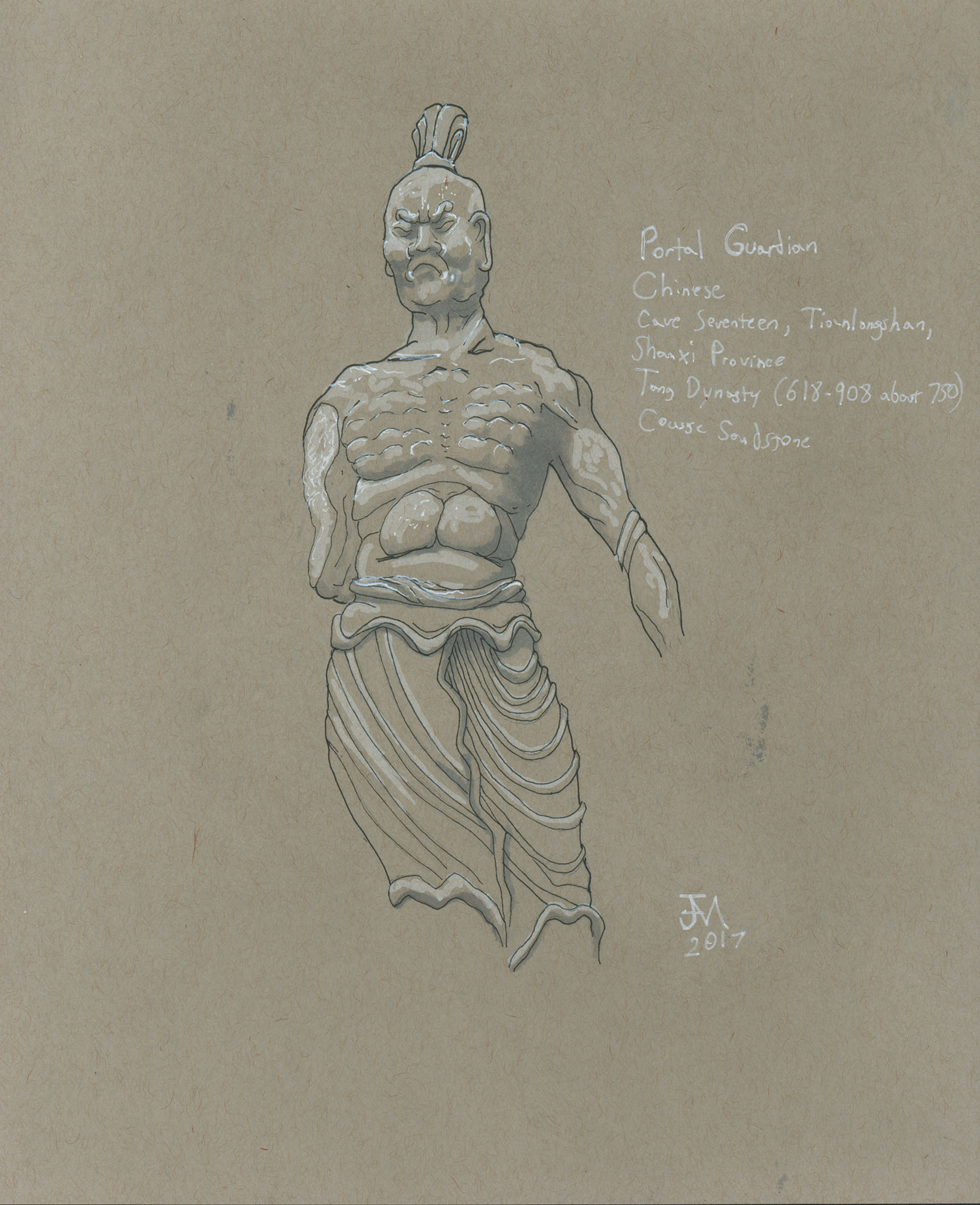 January 2017A pen, grayscale marker and white paint pen drawing of a tomb guardian statue at the Nelson-Atkins Museum. |