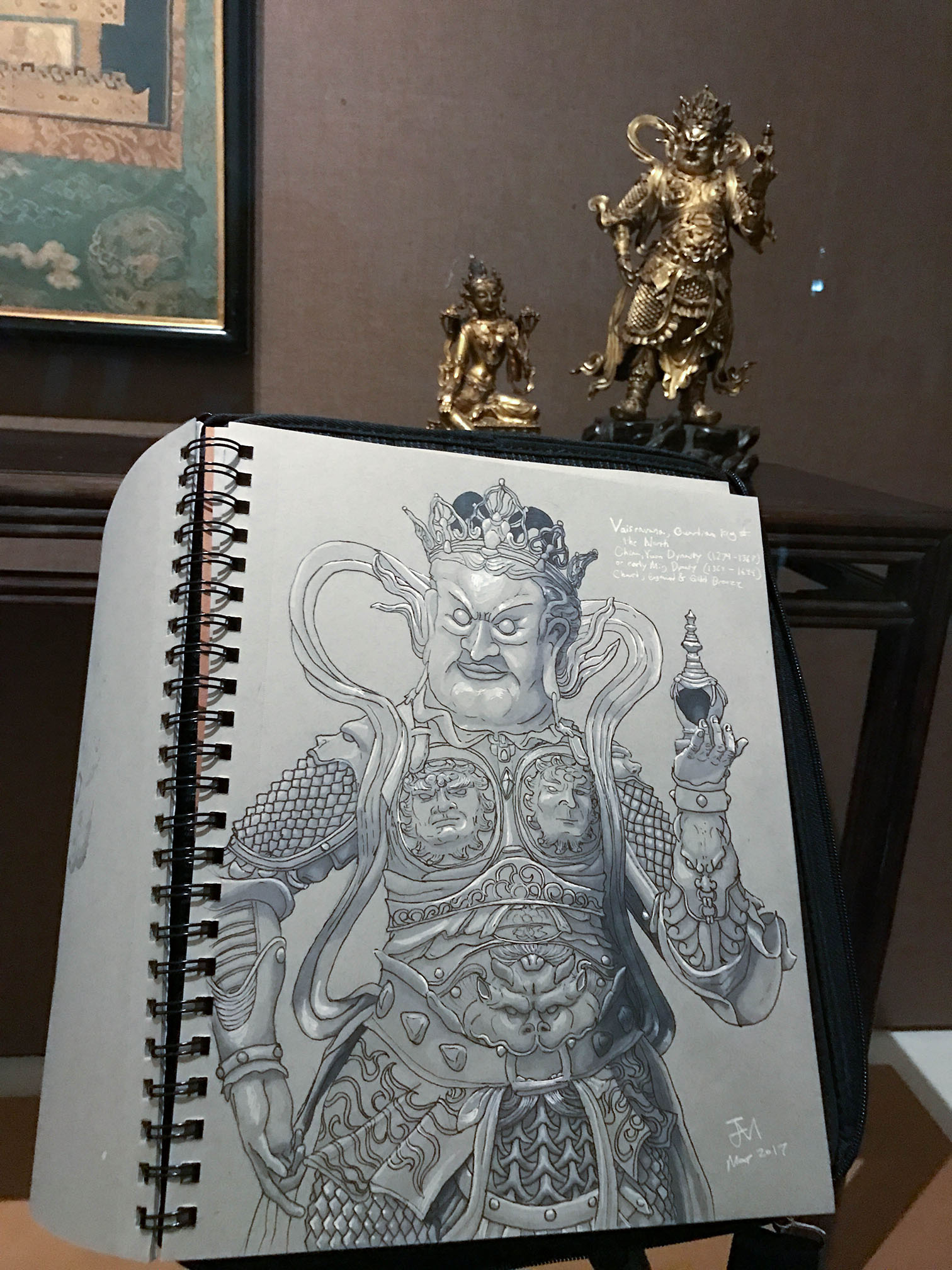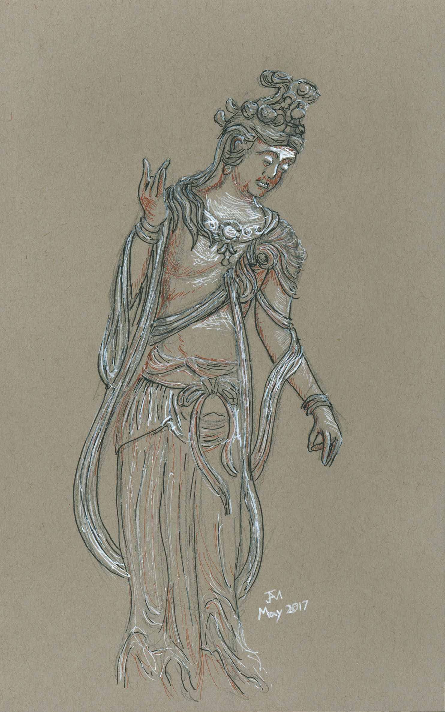 May 2017A pen, pencil and white paint pen drawing of a bodhisattva woodcarving at the Nelson-Atkins Museum. |