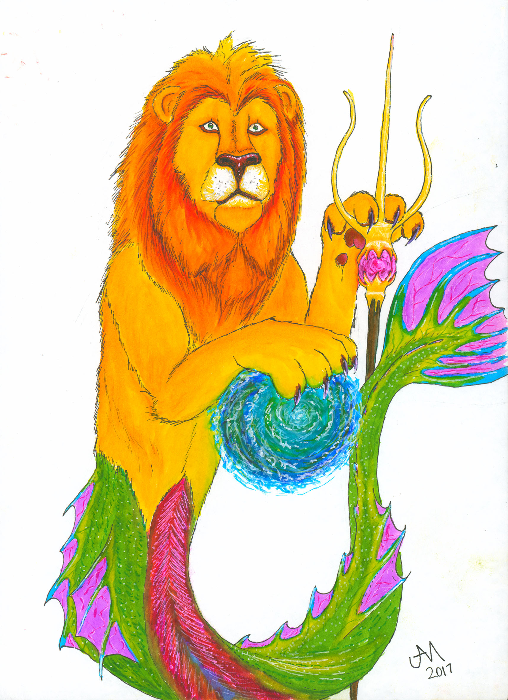 April 2017This is a drawing of a mythical sealion, inspired by a statue seen by friends on a dive trip. |