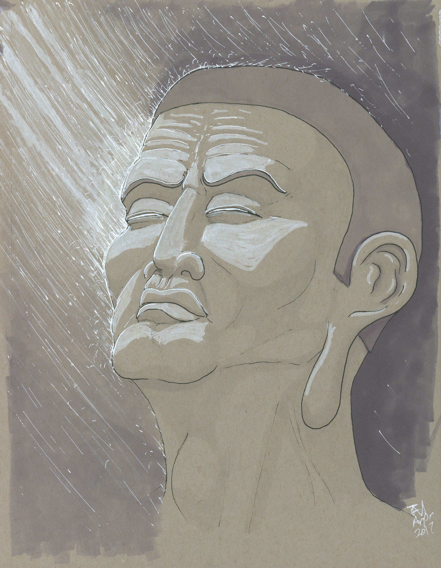 April 2017A pen, grayscale marker and white paint pen drawing of the head of a monk sculpture at the Nelson-Atkins Museum. |