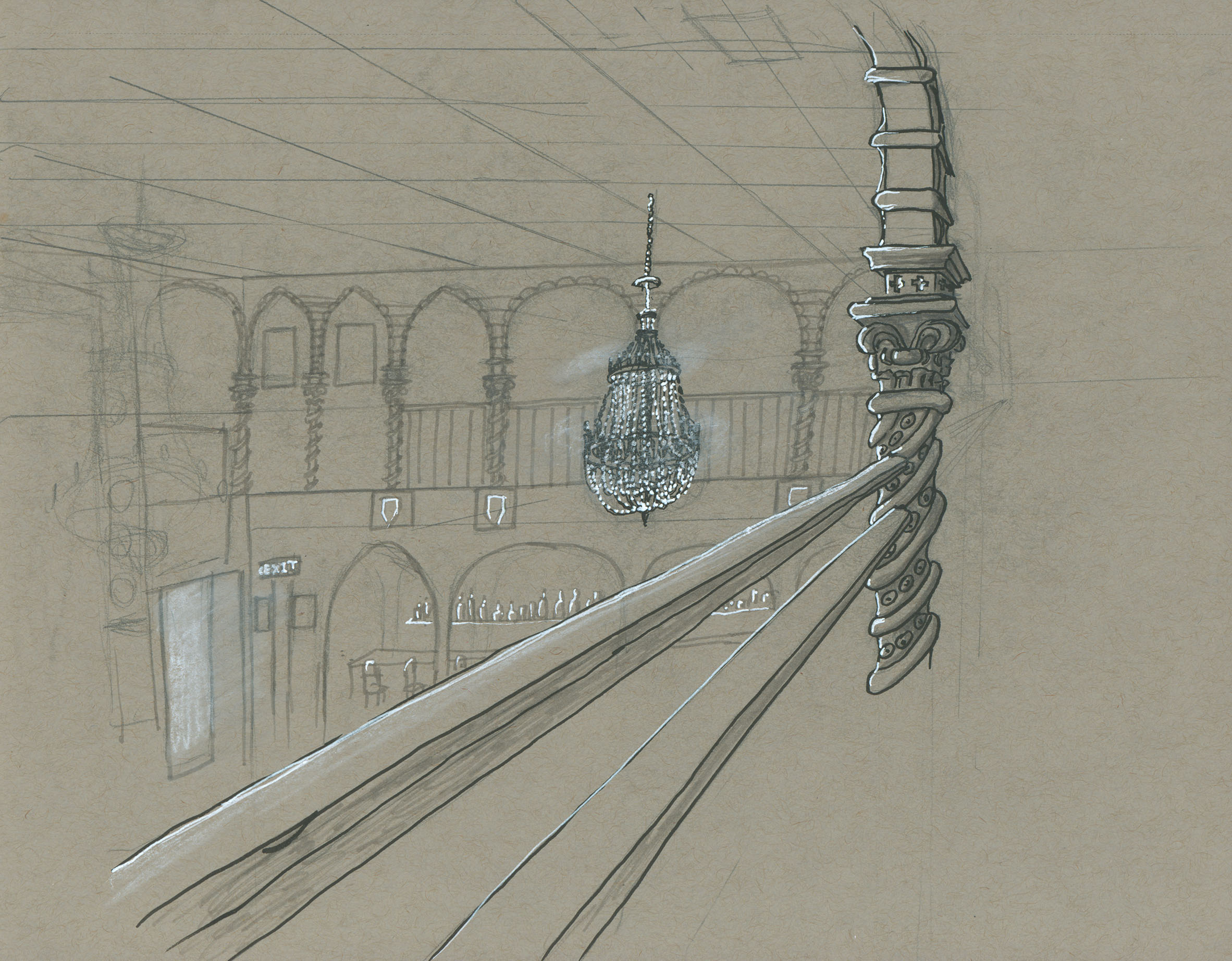 July 2017A pen, pencil grayscale marker and white paint pen drawing of part of a dance venue. I wasn't able to finish it before the lights got shut off, but I also was working without a ruler so it may have been doomed from the start. |