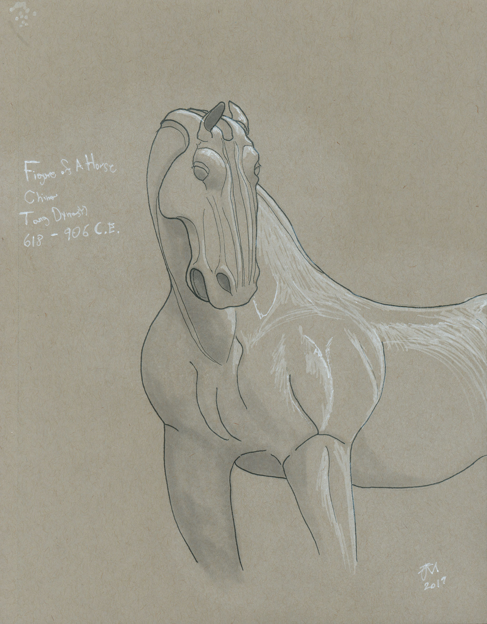 January 2017A pen, grayscale marker and white paint pen drawing of terra cotta horse statue at the Nelson-Atkins Museum. |