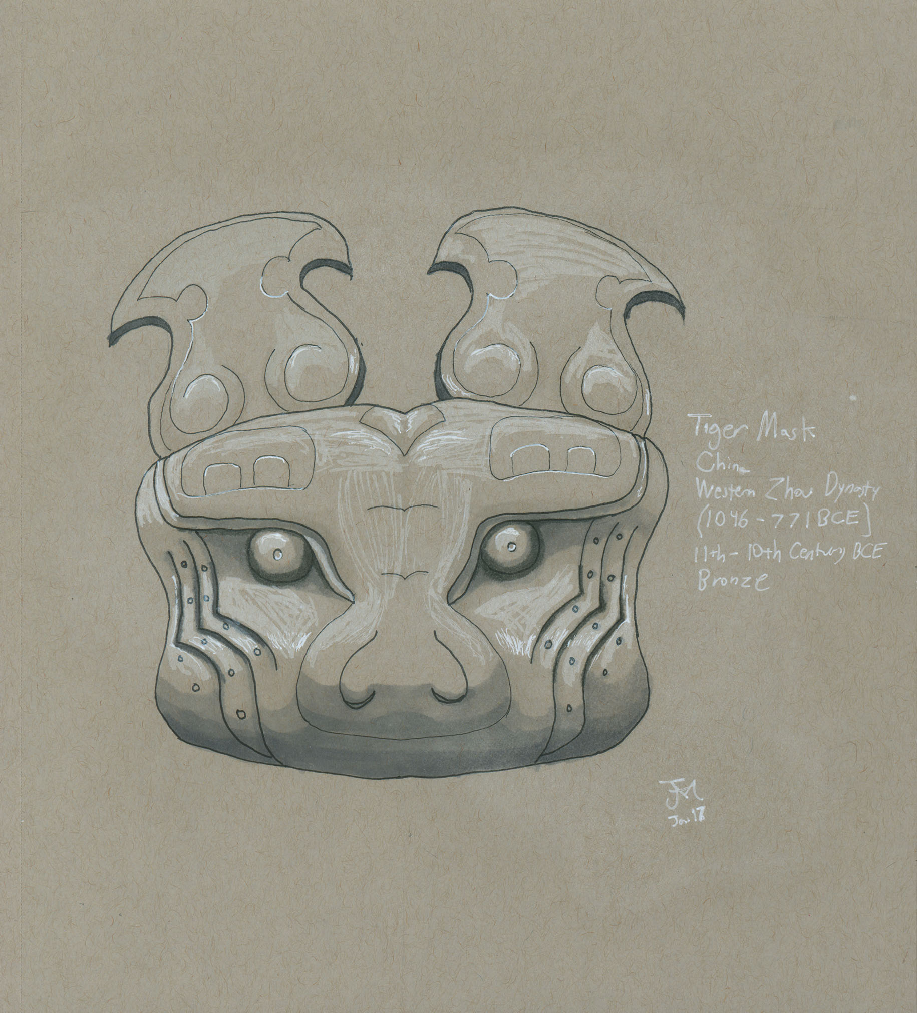 January 2017A pen, grayscale marker and white paint pen drawing of a bronze representation of a tiger face at the Nelson-Atkins Museum. |