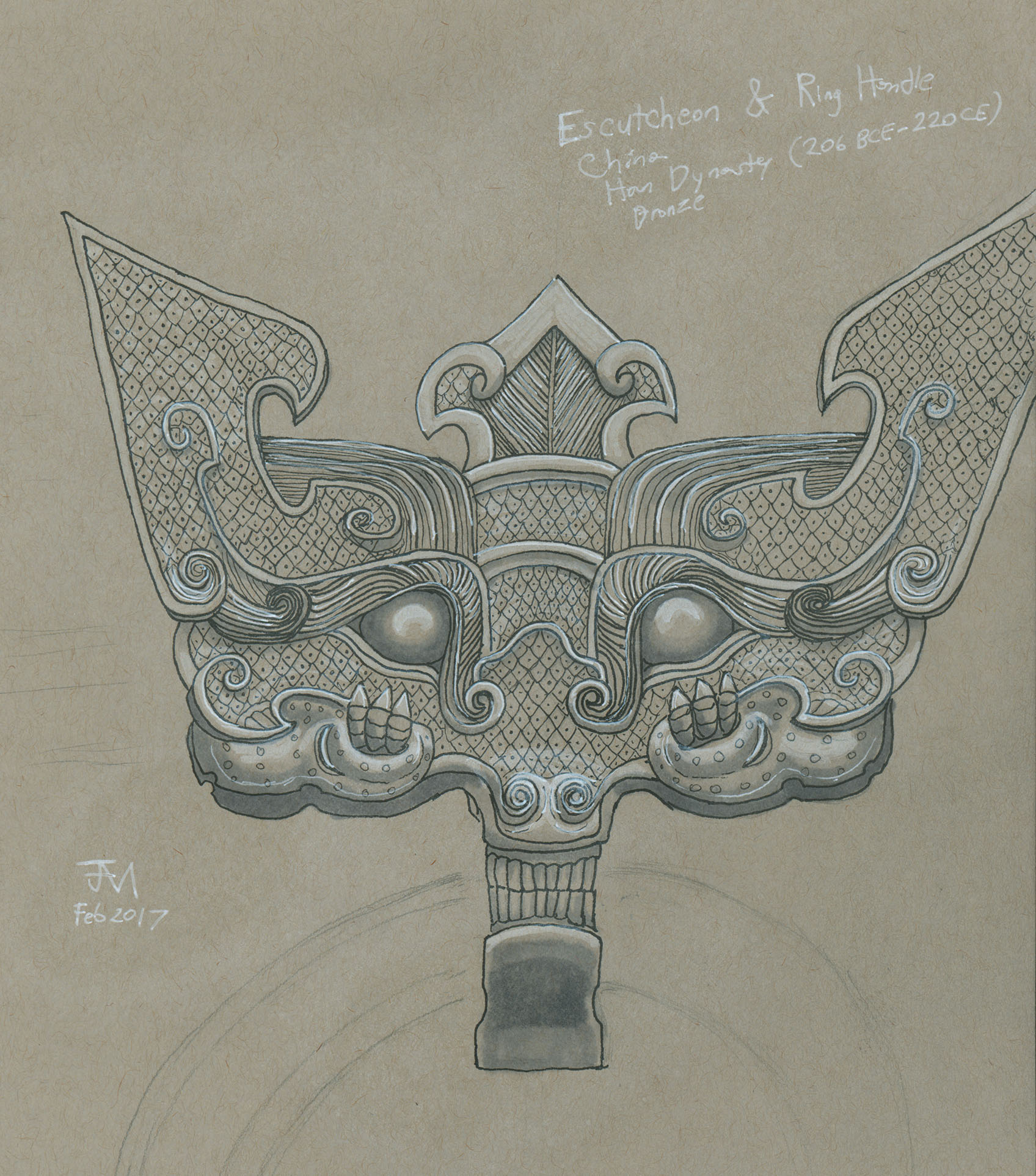 February 2017A pen, grayscale marker and white paint pen drawing of a door-knocker at the Nelson-Atkins Museum. |