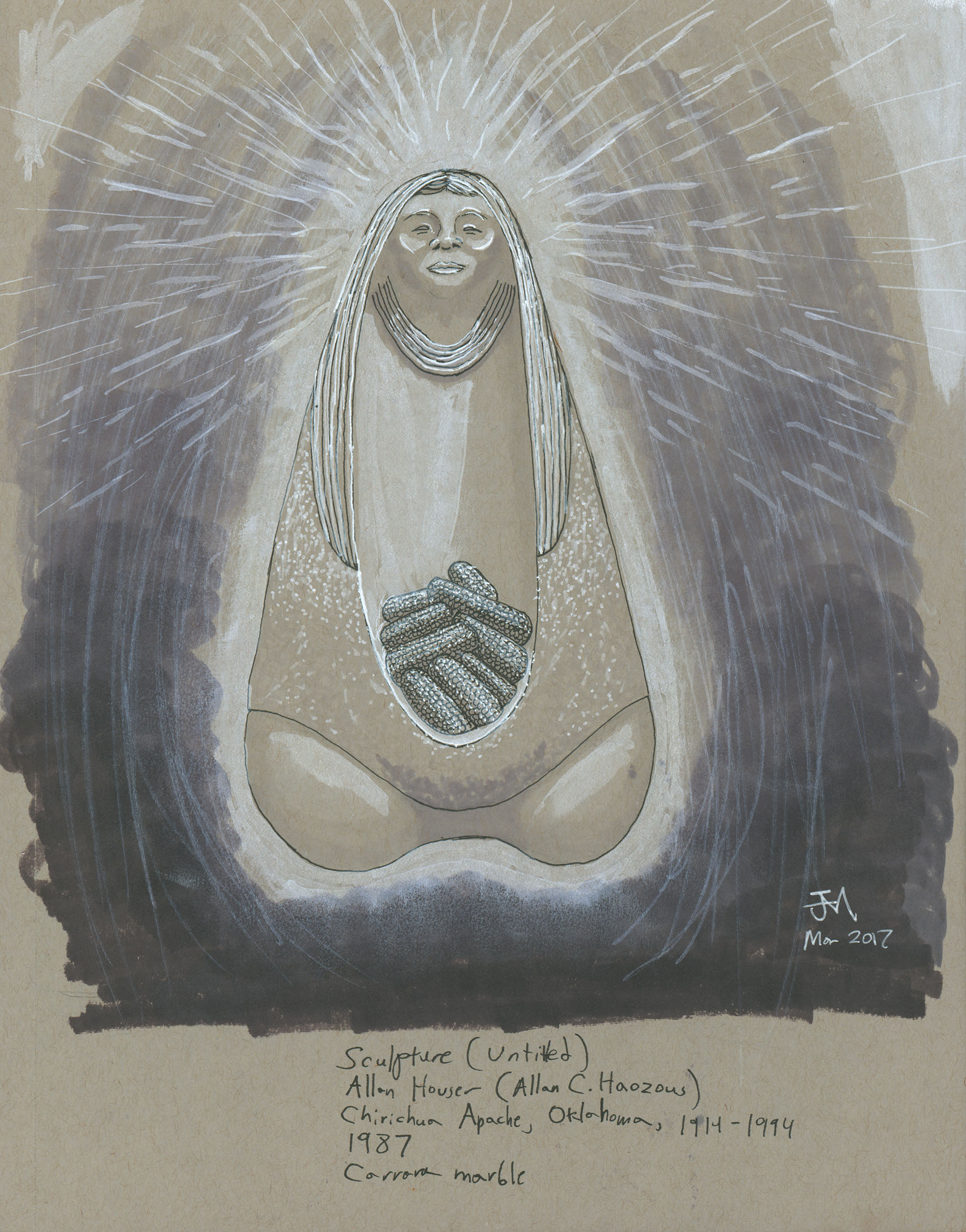 March 2017A pen, grayscale marker and white paint pen drawing of an untitled Native American sculpture at the Nelson-Atkins Museum. |