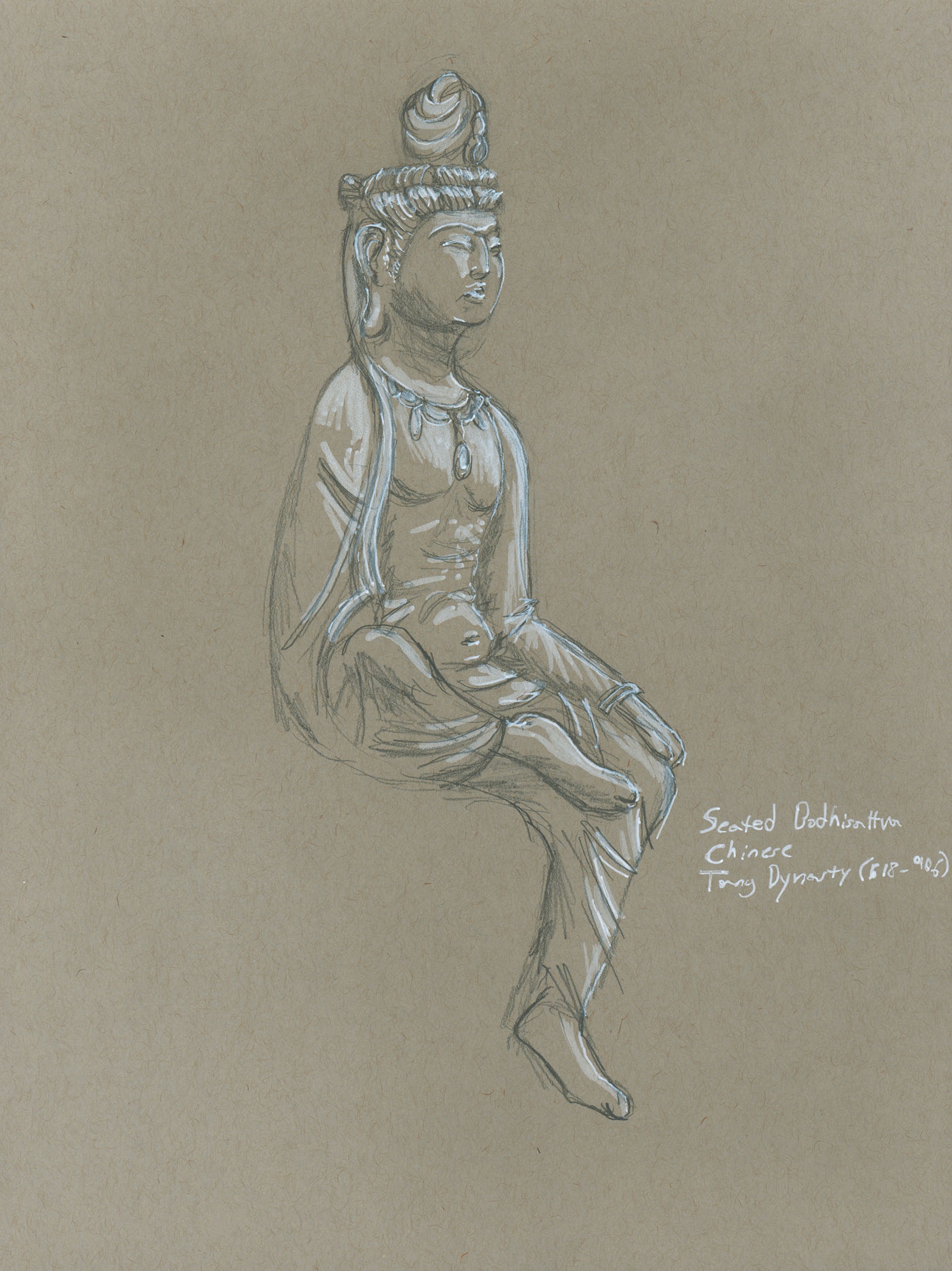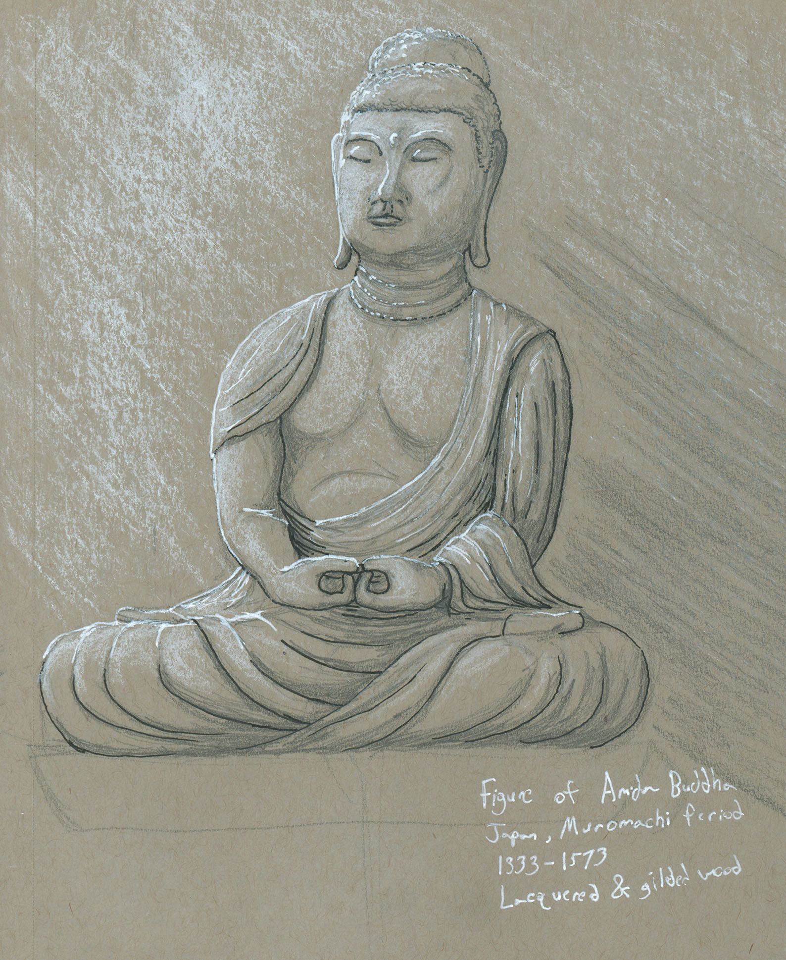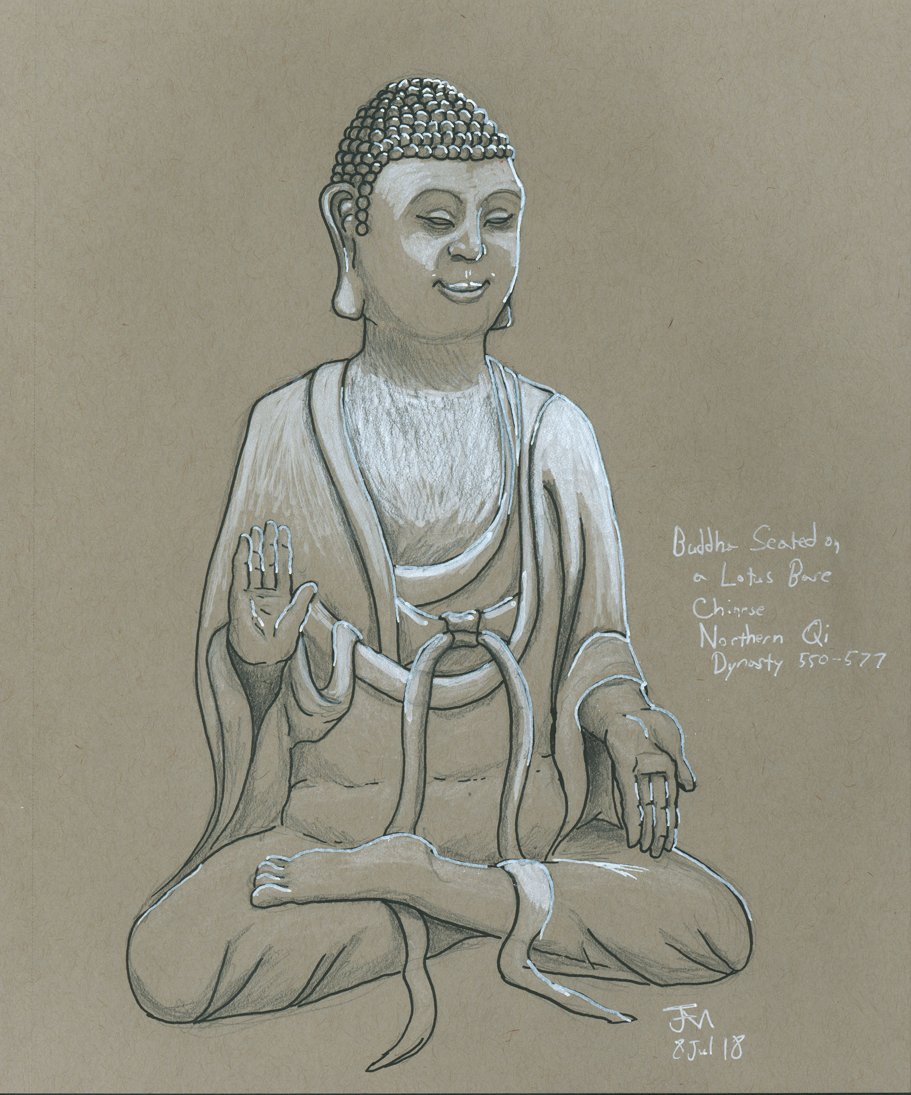 8 July 2018A pencil, pastel, ballpoint, charcoal and white ballpoint sketch of a buddha statue at the Nelson-Atkins Museum of Art. The actual statue is missing its hands, so I approximated them based on the context of the statue and what I've learned from the other statues in the museum. |