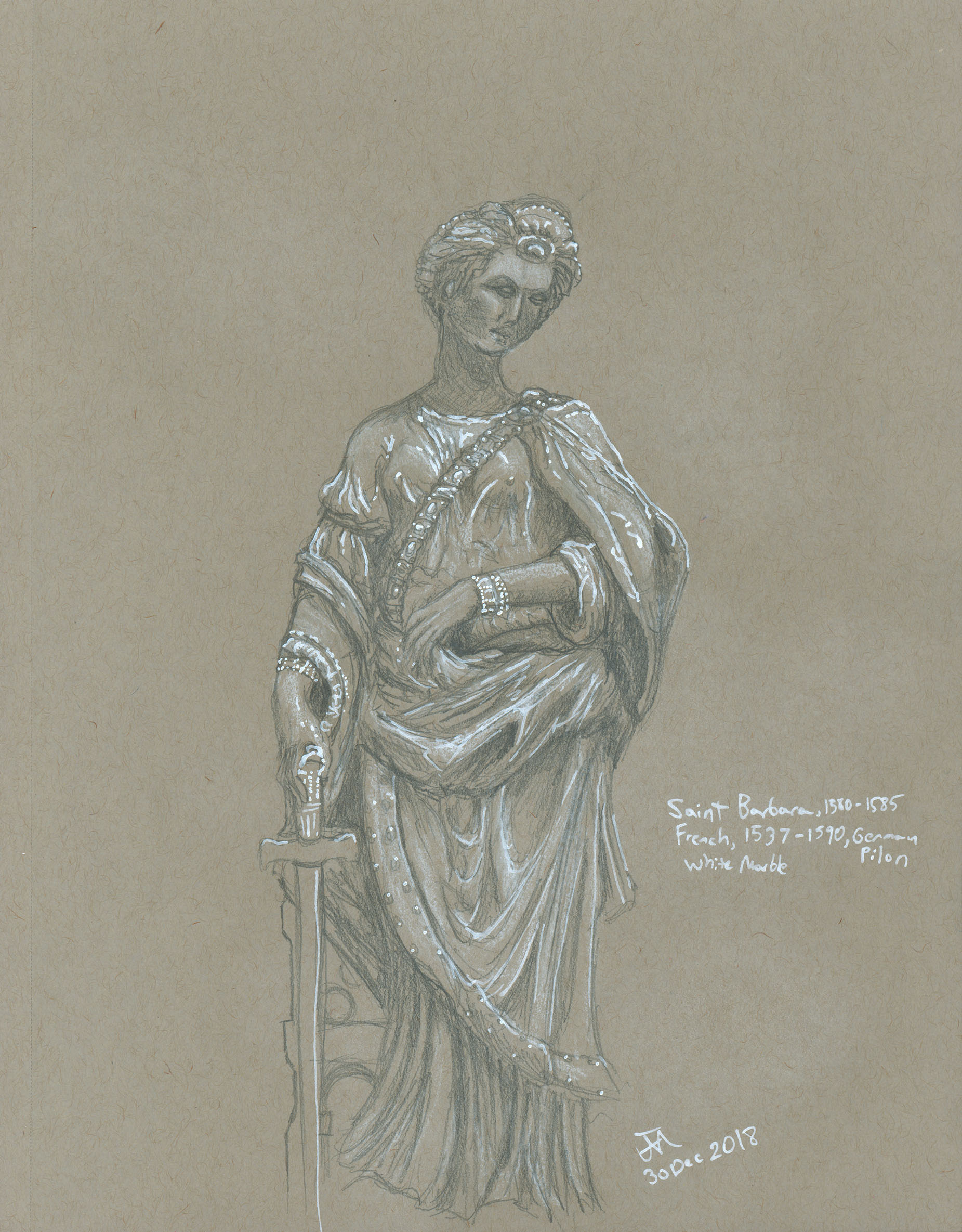 30 December 2018A pencil, charcoal, white pastel and white ballpoint sketch of a marble statue at the Nelson-Atkins Muesum. The original sword is missing from the statue, so I approximated it. |