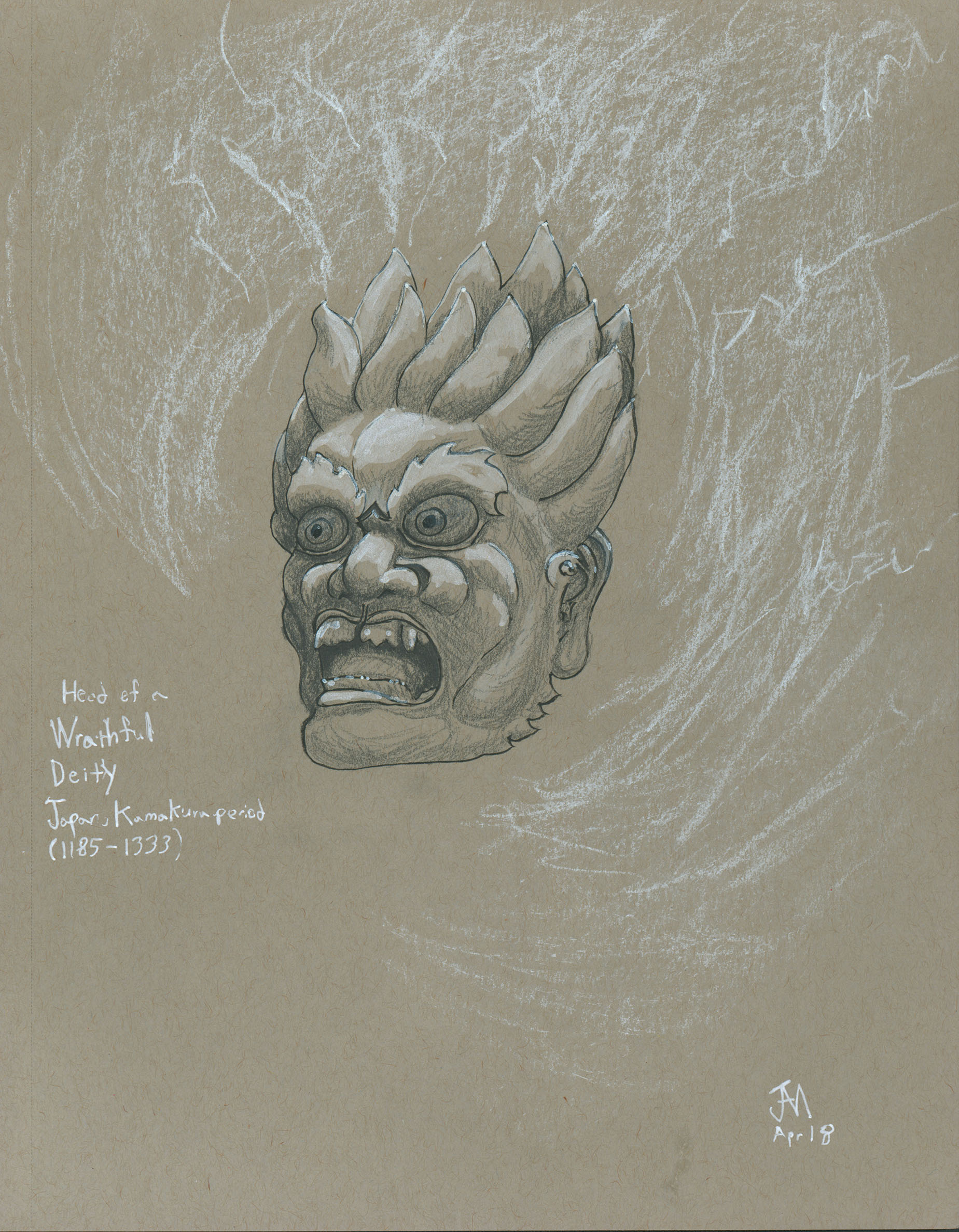 April 2018A pencil, pastel and charcoal sketch of a large woodcarving hanging on the wall near the large buddha at the Nelson-Atkins Museum of Art. |