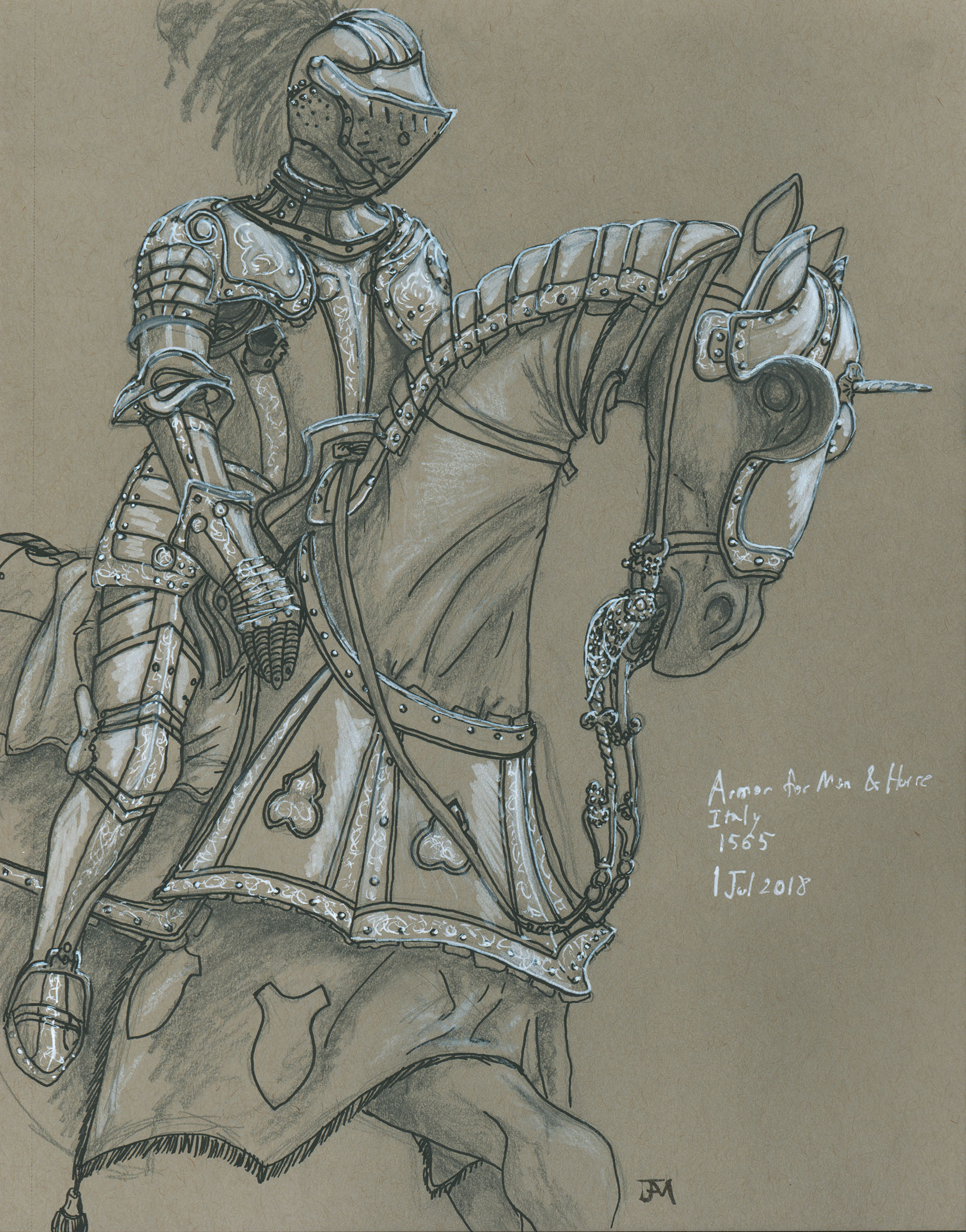 1 July 2018A pencil, pastel, ballpoint, charcoal and white ballpoint sketch of a set of armor at the Nelson-Atkins Museum of Art. |