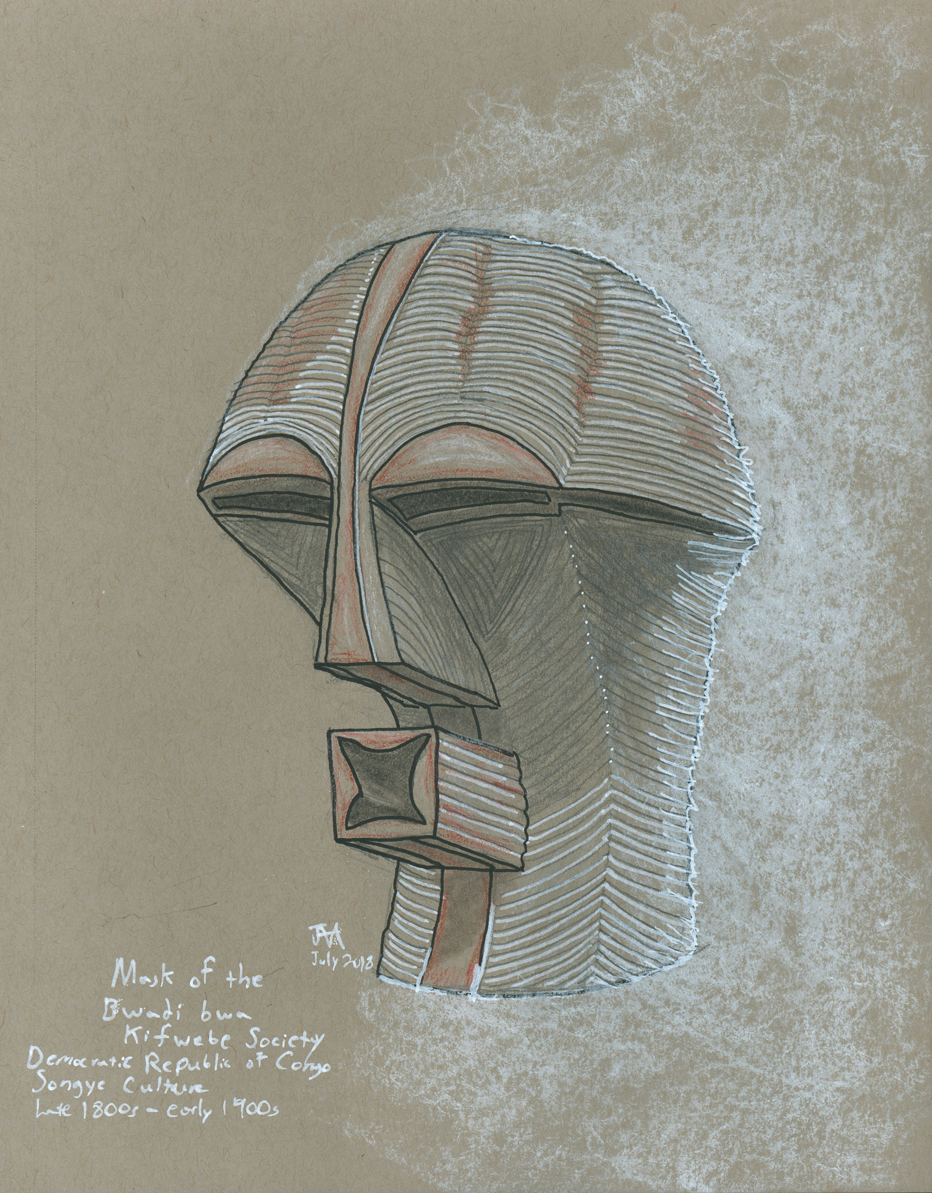 July 2018A pencil, pastel, ballpoint, charcoal and white ballpoint sketch of an Kifwebe society mask at the Nelson-Atkins Museum of Art. |