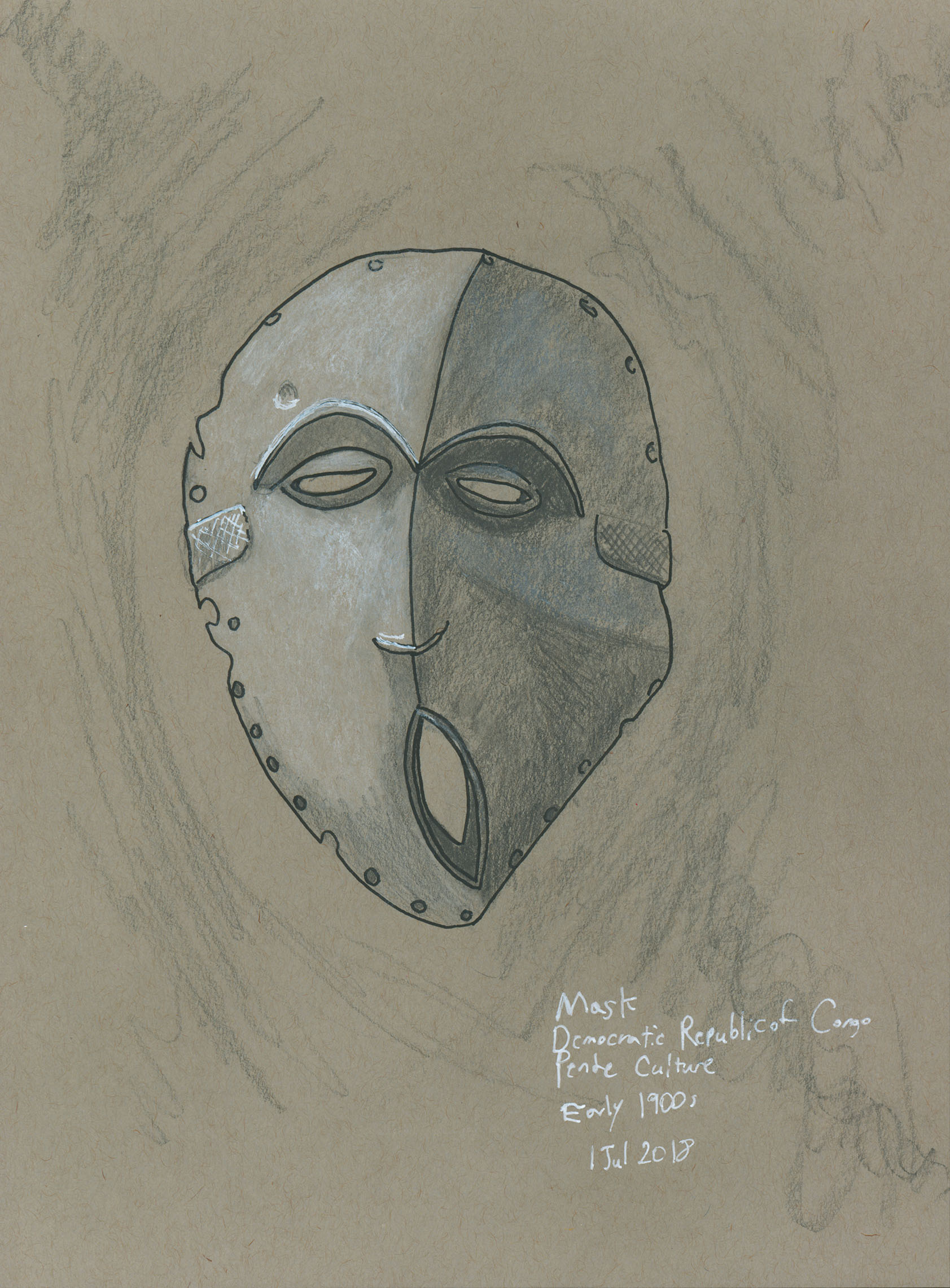 1 July 2018A pencil, pastel, ballpoint, charcoal and white ballpoint sketch of an Pende culture mask at the Nelson-Atkins Museum of Art. |