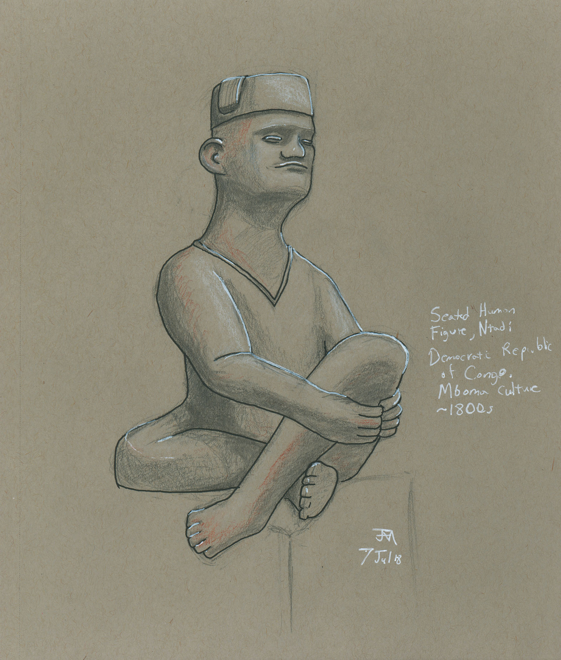 7 July 2018A pencil, pastel, ballpoint, charcoal and white ballpoint sketch of an Mboma culture statue at the Nelson-Atkins Museum of Art. This is perhaps my favorite little sculpture in the entire museum: this little guy looks very much like he has life figured out. |