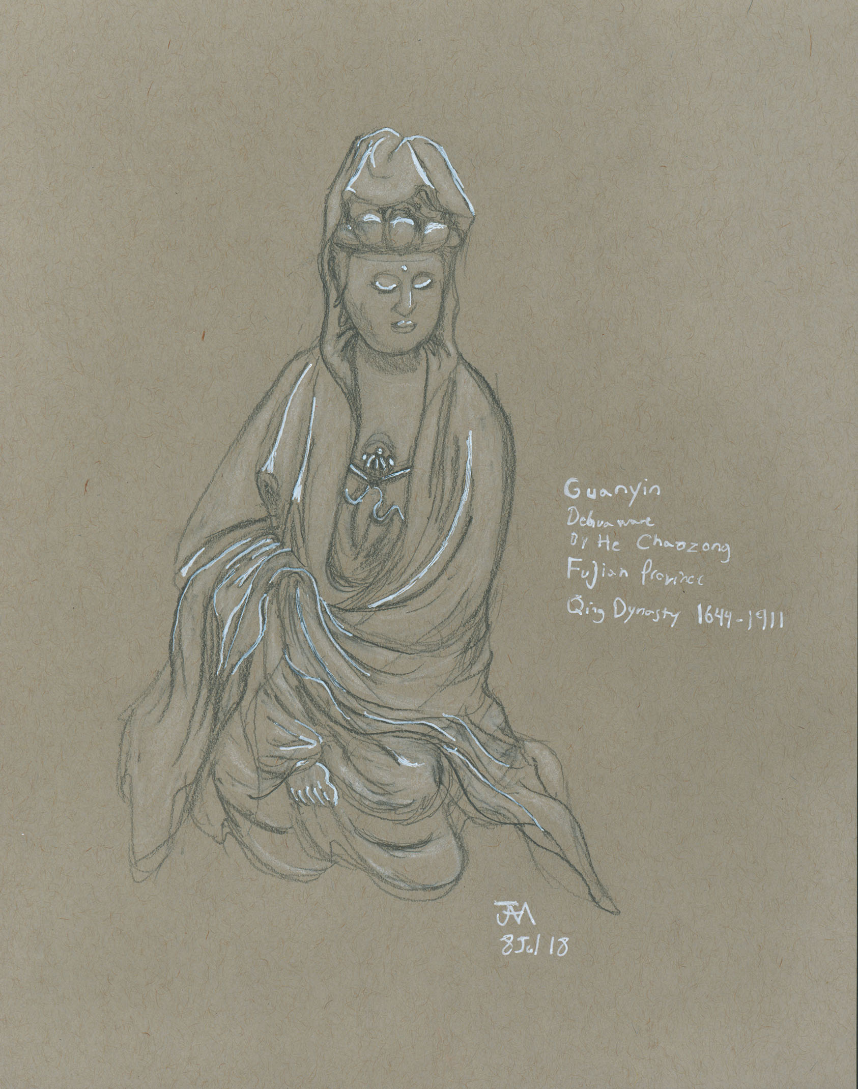 8 July 2018A pencil, pastel, and white ballpoint sketch of a ceramic statue at the Nelson-Atkins Museum of Art. The actual statue is missing its hands, so I approximated them based on the context of the statue and what I've learned from the other statues in the museum. |